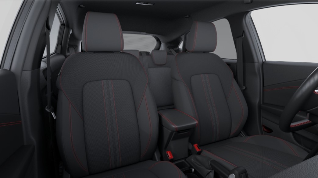• Siège en tissu noir avec surpiqûres rouges
